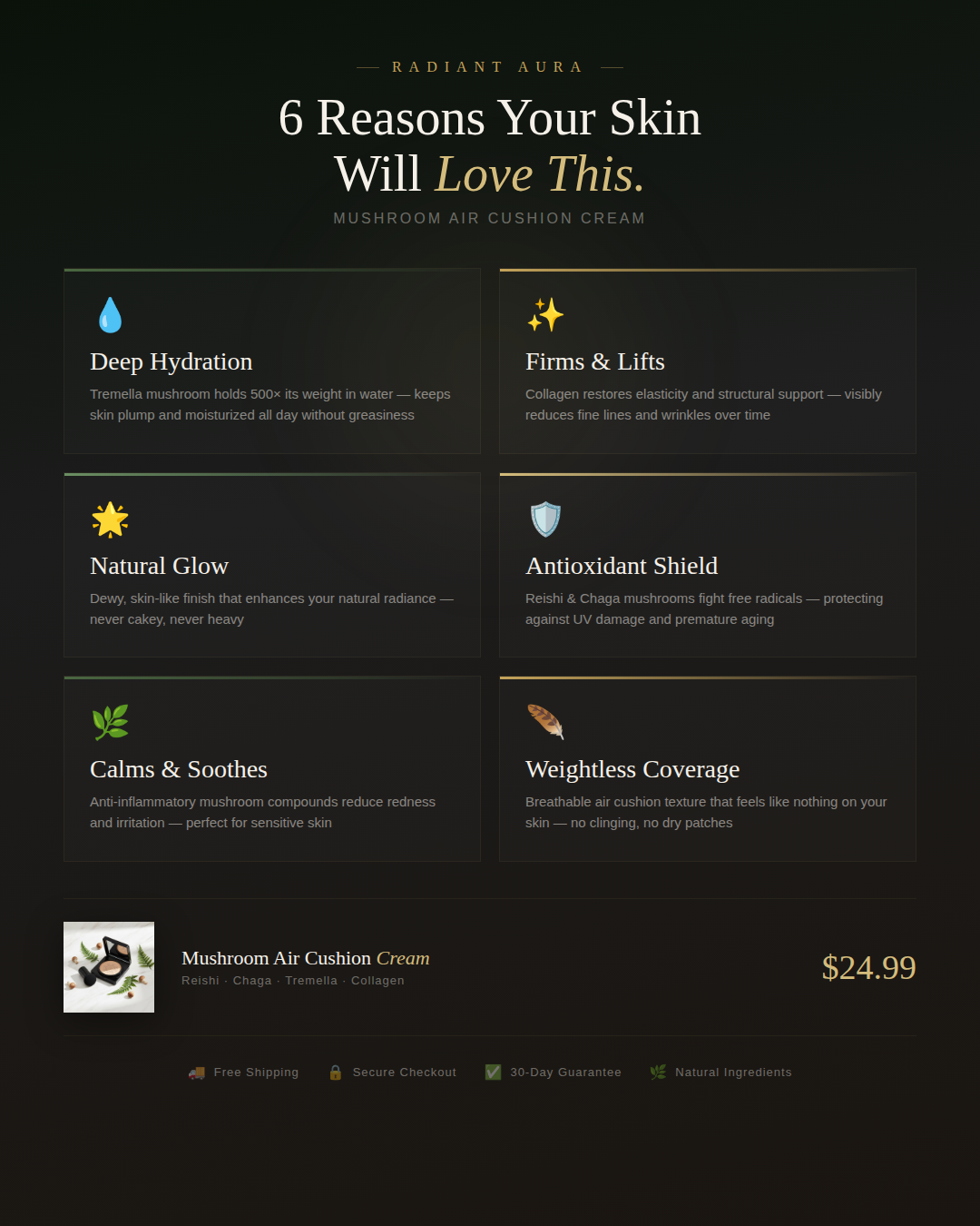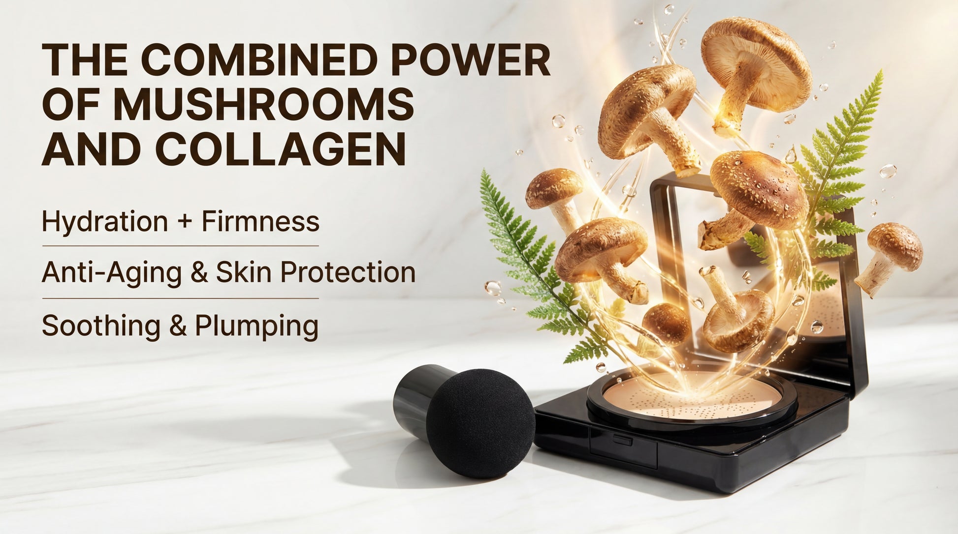 Reishi, Chaga, and Tremella mushroom extracts for hydration, soothing, and antioxidant protection. Collagen for firmness and fine line reduction. No harsh chemicals.